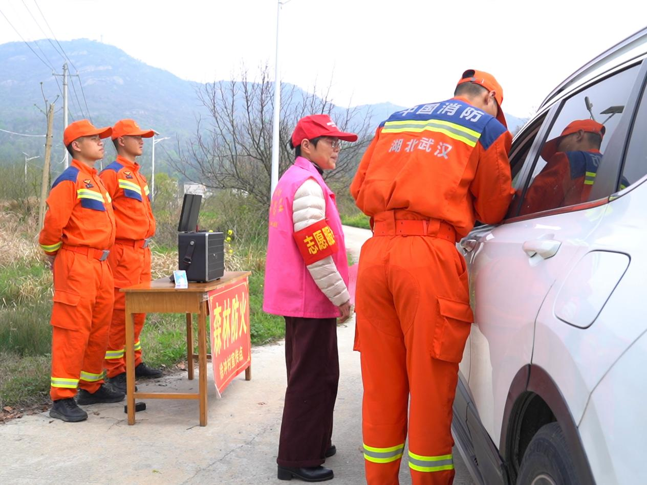 武汉市消防救援支队联合街道干部、护林员设立临时执勤点,对进入林区、墓区的人员和车辆逐一检查(央广网发 武汉市消防救援支队供图)