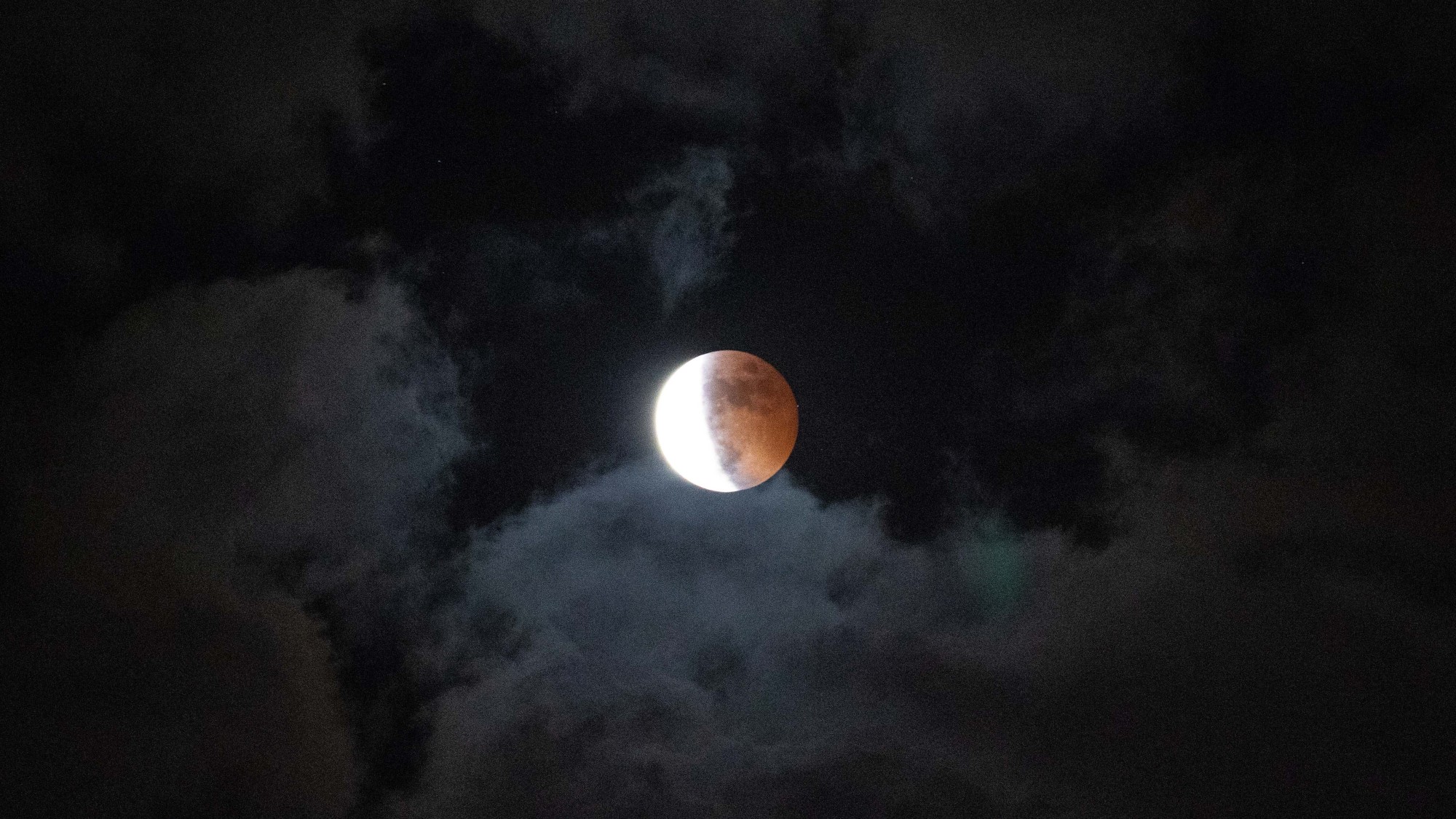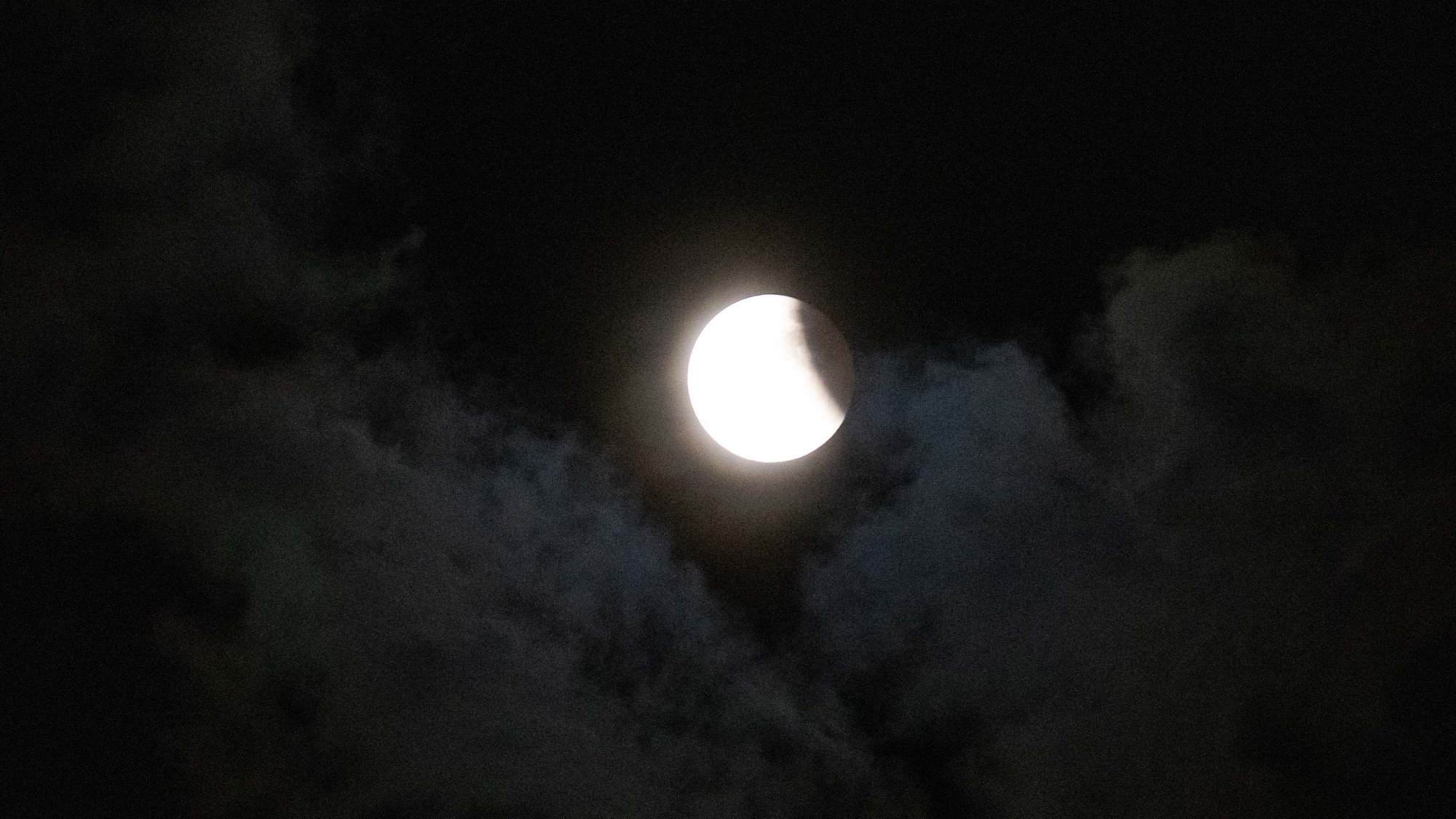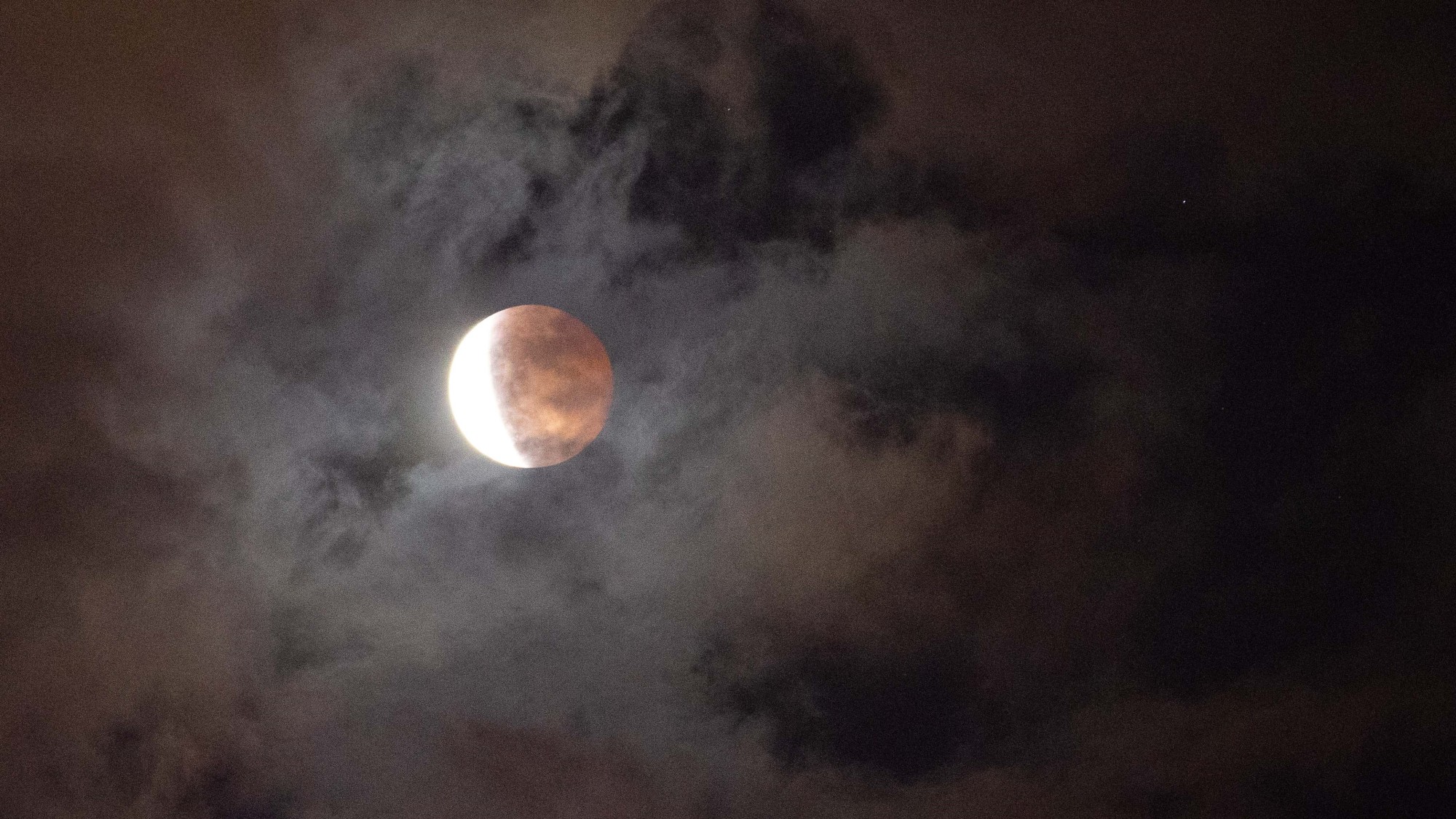 央广网武汉11月9日消息(记者张迪 实习生邓子依)11月8日晚,一场精彩的月全食现身天际。当晚,武汉天气晴转多云,虽然多云天气对观测月全食造成了一定的影响,但云层中时隐时现的“红月亮”也为观测者献上了“云掩红月”的奇观。