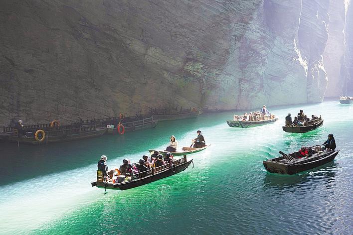 11月24日,游客在鹤峰县屏山峡谷坐船游玩。初冬时节屏山峡谷迎来迷人景观,正午时分,阳光穿过幽深地缝,将蜿蜒的“一线天”照亮,舟行水上若悬浮于空中,吸引了众多游客前来打卡,带动了景区游客量和旅游热度攀升,实现了淡季也旺的目标。
