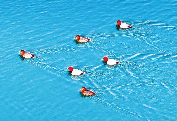 12月5日,在南水北调中线工程核心水源涵养地——十堰市郧阳湖国家湿地公园,十几只红头潜鸭在觅食嬉戏(上图)。近年来,郧阳区加大湿地保护和修复力度,良好生态吸引骨顶鸡、斑嘴鸭、苍鹭等鸟类在郧阳湖“安家”。其中青头潜鸭为国家一级保护野生动物,红头潜鸭为国家二级保护野生动物。(视界网 周家山 摄)