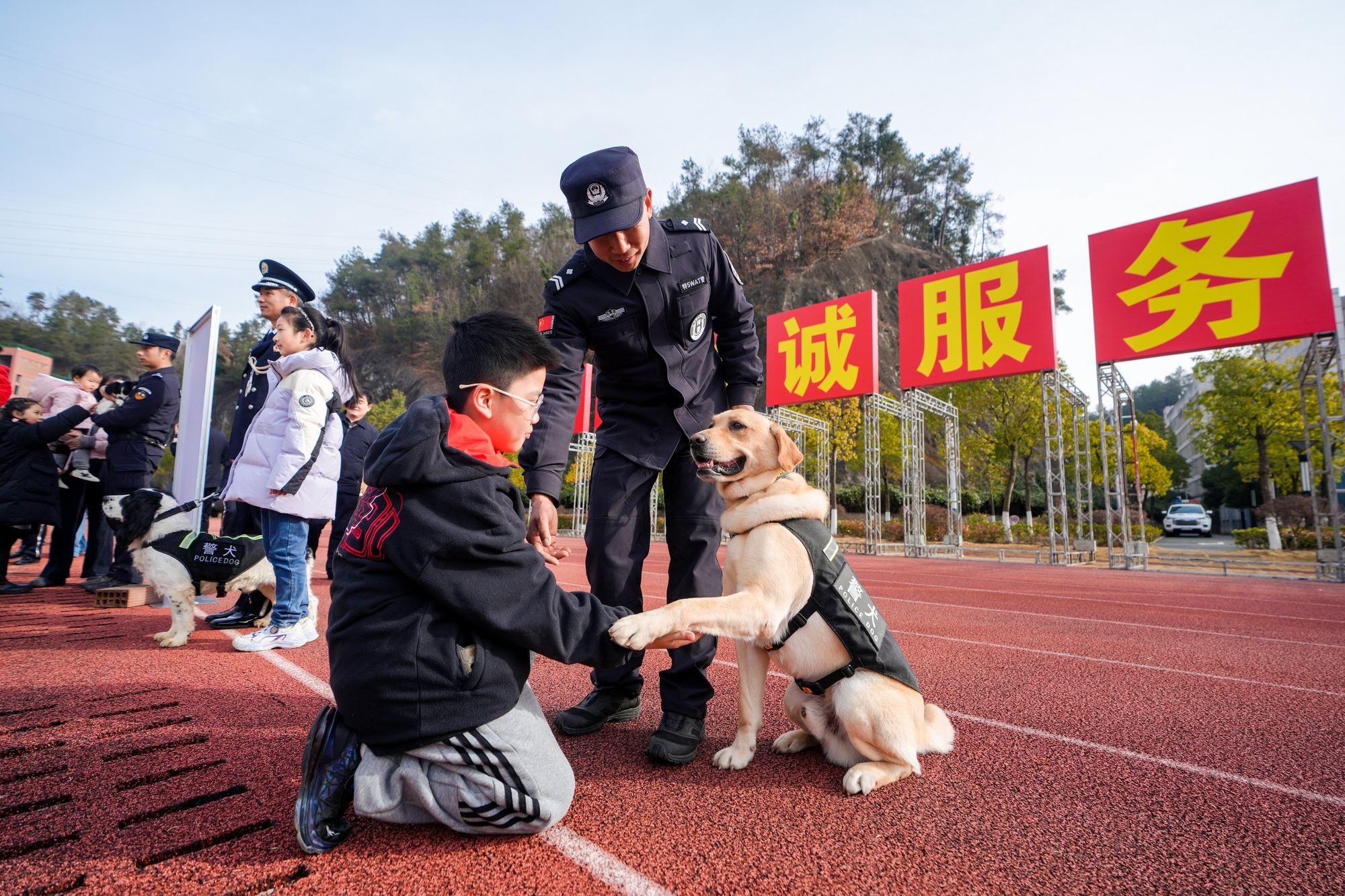“警宝”与警犬互动(央广网发 十堰市公安局供图)