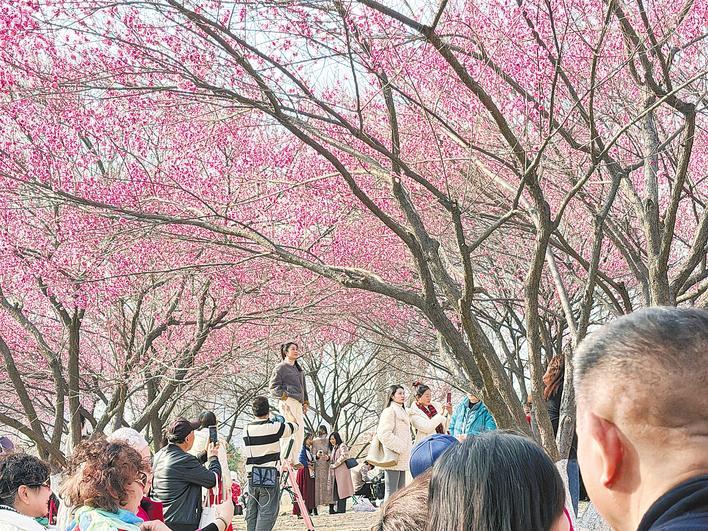虽是工作日午后,坡上已有数百位市民游客漫步赏玩。花影人潮中,除了专程而来的摄影爱好者架起“长枪短炮”,更有许多家庭扶老携幼,在梅林间游玩、野餐。曾是约拍行业淡季的隆冬时节,也成了旺季。“花期比往年早了近一个月,好几个周末的‘约拍’都排满了。”摄影爱好者周女士边调整镜头边说。据摄影师“四叶草”介绍,周末这里人流如织,即便今天是工作日,前来拍照的游客依然不少。“目前‘梅花坡’花开得最盛,大家都抢着来出片,竞争压力不小。眼下的梅花是开年第一波热度。”