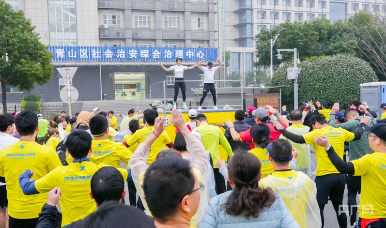2026武汉青山迎春跑选手们赛前热身(央广网记者邓子依 摄)