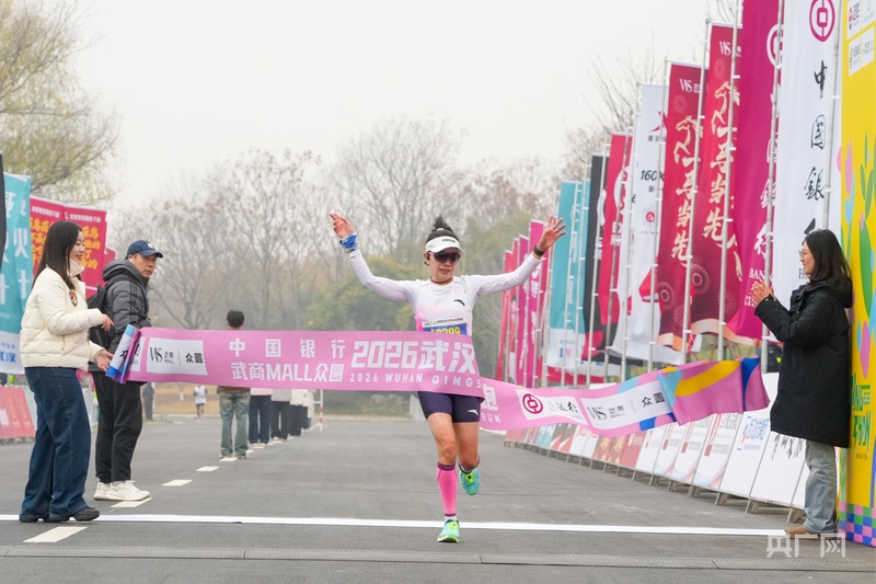2026武汉青山迎春跑女子组冠军冲线瞬间(央广网记者邓子依 摄)