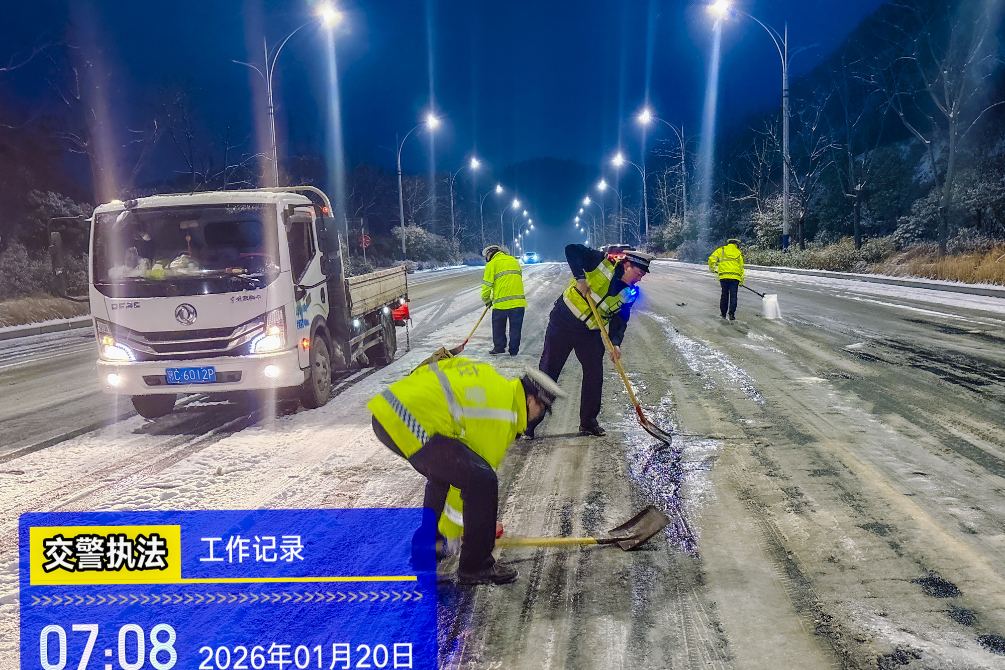 十堰经开区交警清晨铲除路面积雪(央广网发 十堰经开区融媒体中心供图)