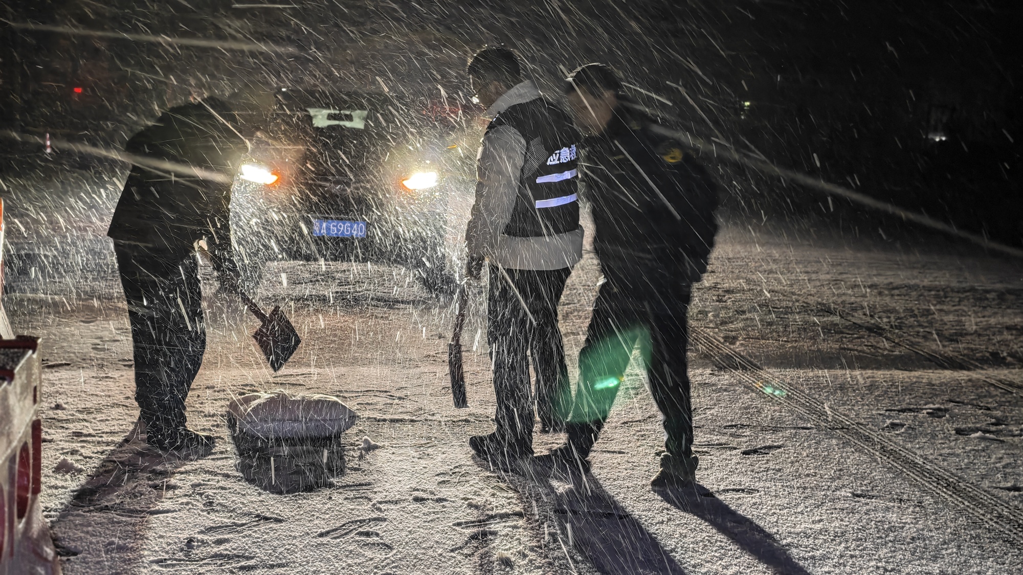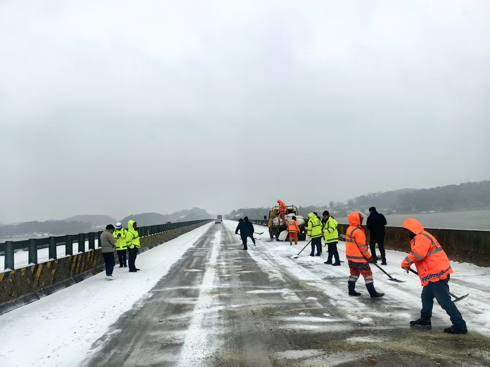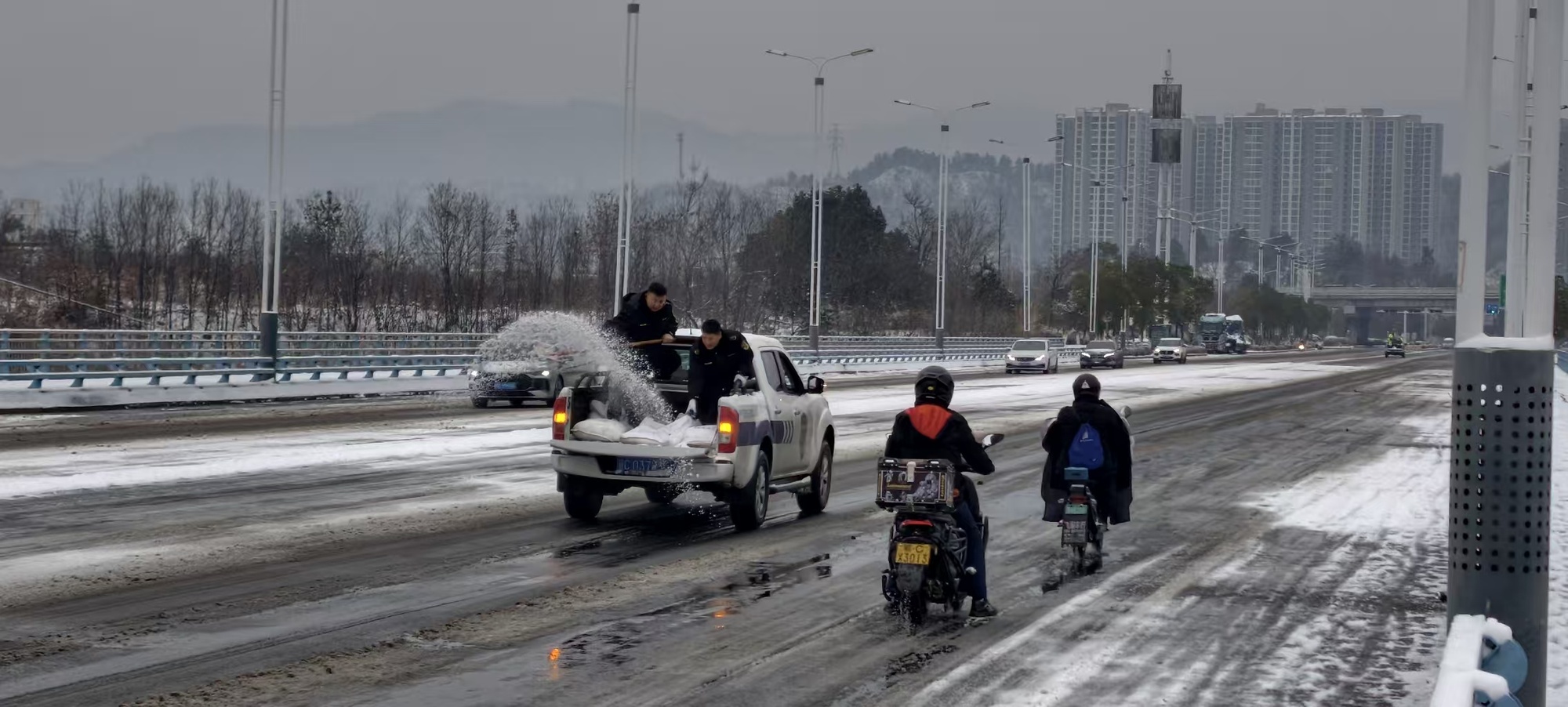 1月20日凌晨,孝感市汉川市脉旺镇组织应急工作人员对三八河桥、丁字桥等重点路段开展撒盐作业,防范道路结冰、保障出行安全(央广网发 孝感市应急管理局供图)