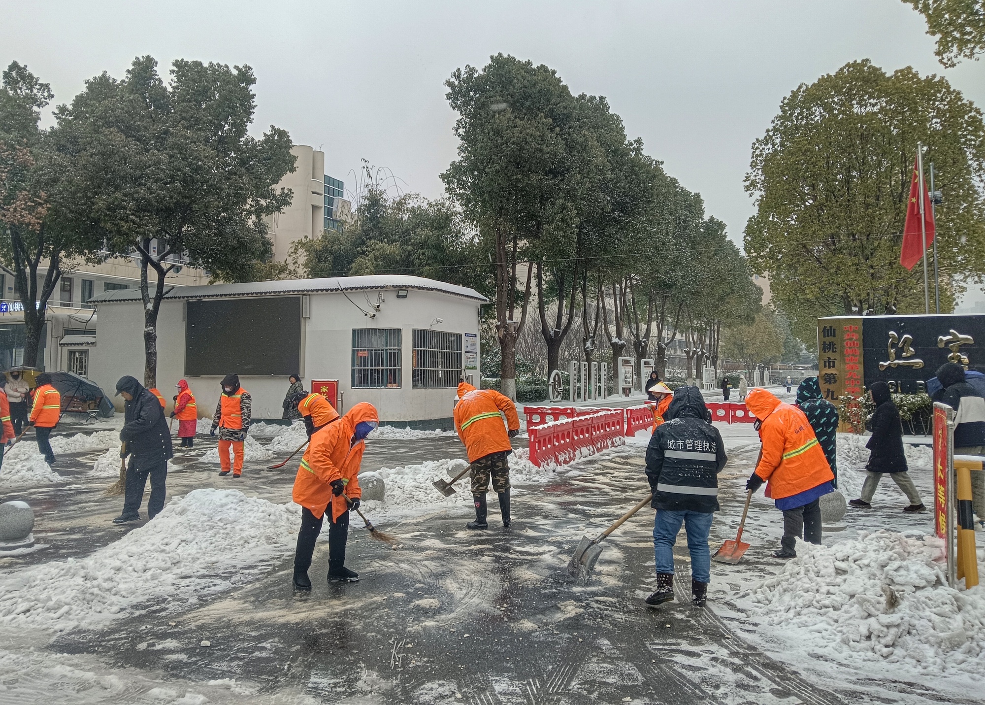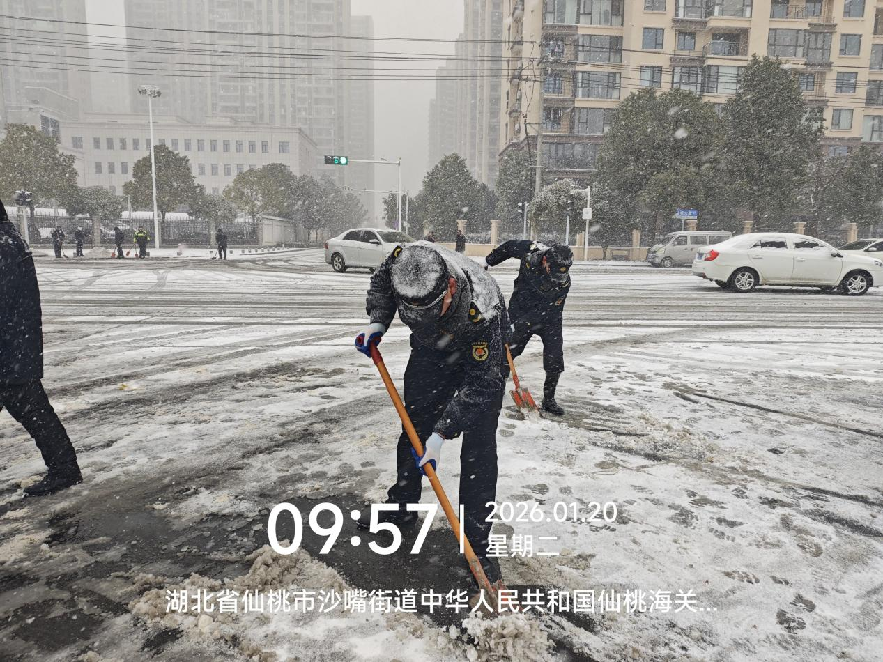 仙桃市城市管理执法局城管队员在新城大道海关门前铲冰除雪(央广网发 仙桃市城市管理执法局供图)