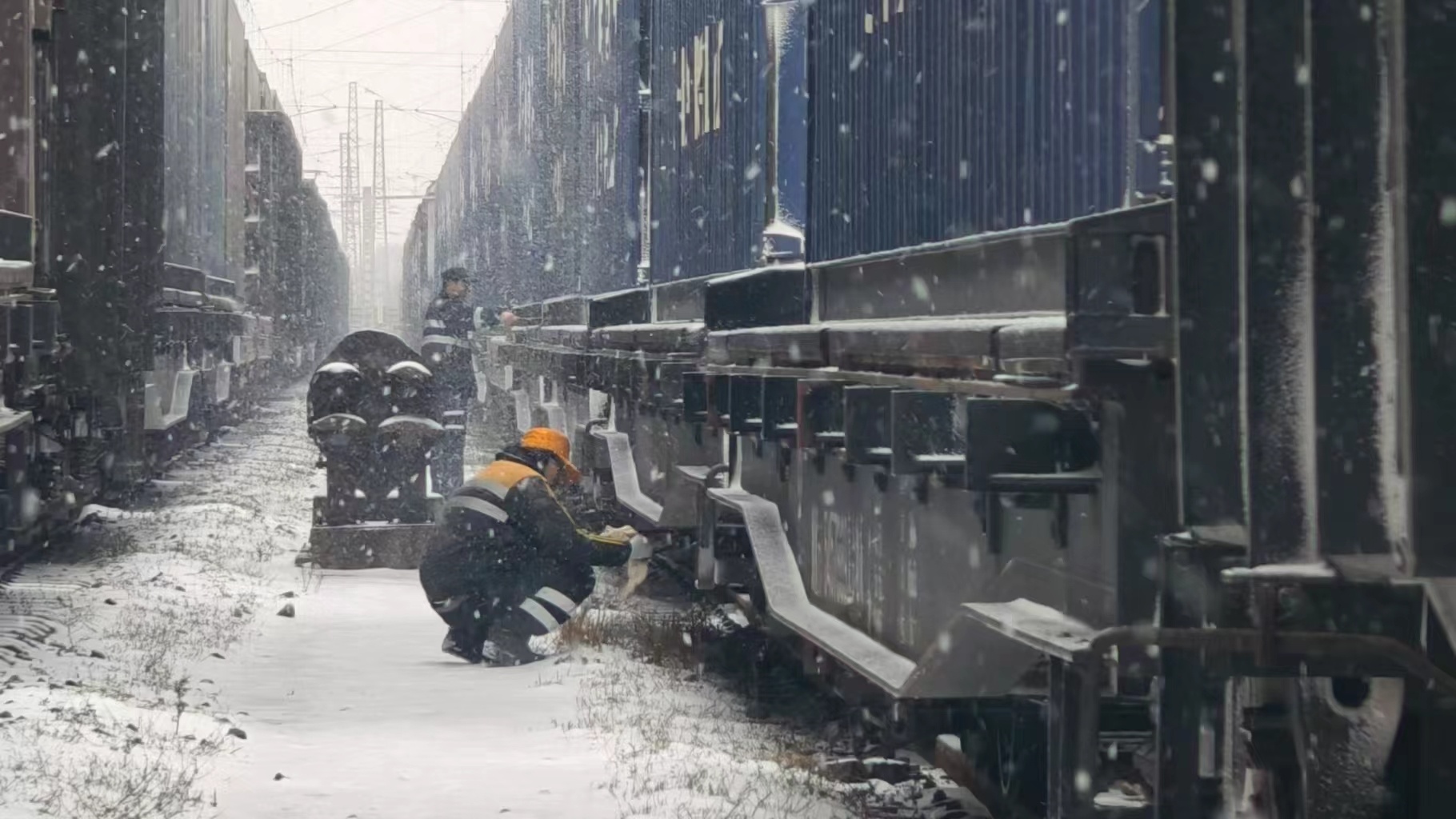 武汉北车站连结员在雪中进行拉风作业(央广网发 中国铁路武汉局集团有限公司供图)