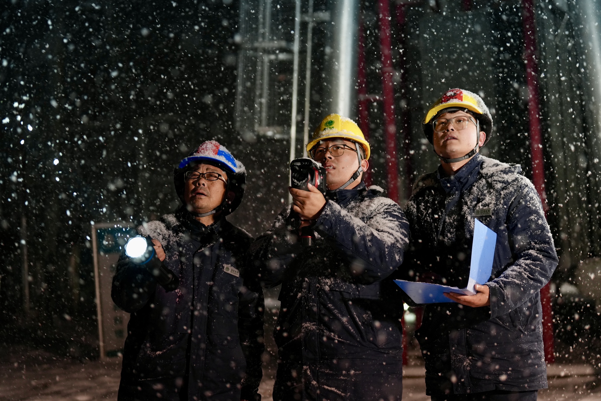 1月19日晚,国网襄阳供电公司变电运检分公司汾阳运维班副班长罗长林、姚竞宙,开关检修班况耀等骨干组成运检团队坚守一线(央广网发 国网襄阳供电公司供图)