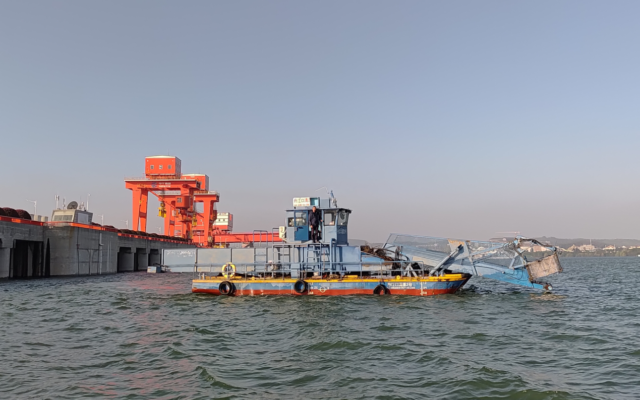 清漂船在丹江口大坝附近水域作业(央广网记者 张卓 摄)