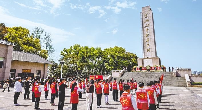 近日,全省各地群众广泛开展清明祭英烈活动。图为4月4日,宜昌市烈士陵园“追寻·2026·清明祭英烈”少先队主题队日活动现场,少先队员向先烈默哀并敬献鲜花。(湖北日报全媒记者 刘曙松 通讯员 韩波 摄)