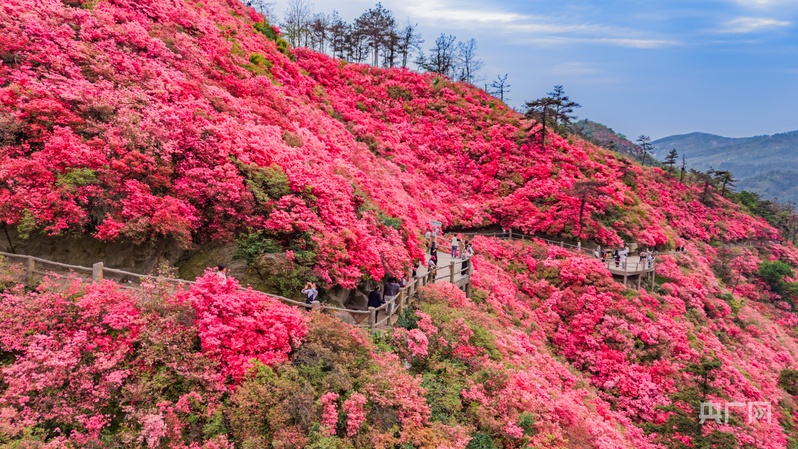 央广网武汉4月11日消息(记者左洋 见习记者陈晟)春风十里,花开满山。4月初,武汉市黄陂区云雾山迎来一年中最美的时节,万亩野生杜鹃迎来盛花期,将连绵的山峦装点成一幅绚丽的春日画卷,吸引着全国各地的游客共赴这场“花海之约”。自3月中旬开启赏花季以来,这场春日盛事的热度便持续攀升:截至目前,云雾山景区已接待游客近30万人次,春季旅游人数同比增长约30%,其中外地游客占比达到了30%以上。