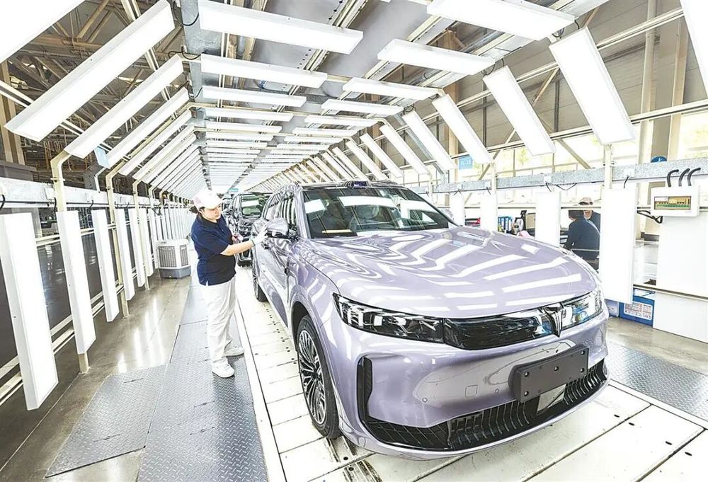 岚图汽车总装车间内,工人在流水线上作业,一辆辆新能源汽车驶下生产线。(湖北日报全媒记者薛婷摄)