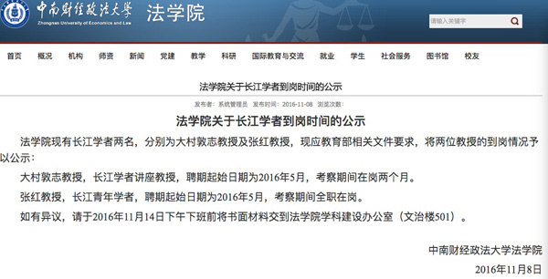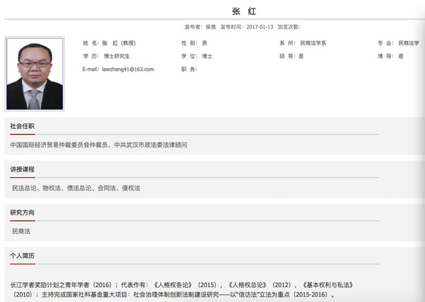 在中南财经政法大学法学院官网,澎湃新闻记者在“领导队伍”一栏确实未见“张红”的名字。在更新于今年1月13日的法学院教师资料页面,张红的“职务”一栏空白,不过他依然是硕导和博导,“个人简历”中也提及他是长江学者奖励计划之青年学者。