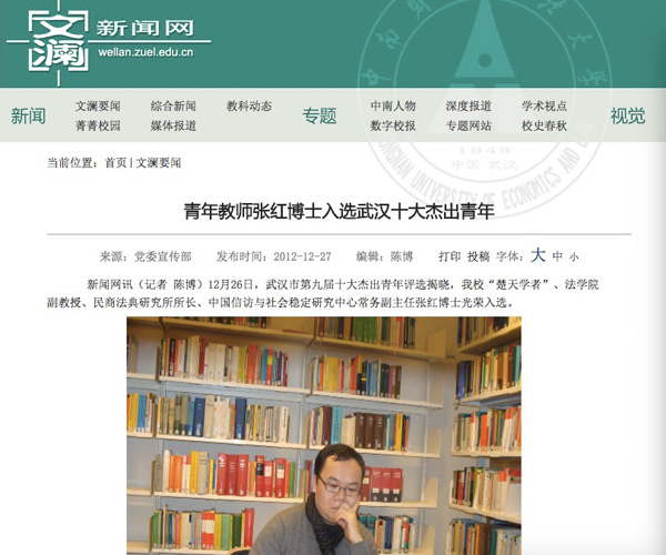 报道称张红在《中国社会科学》、《法学研究》等期刊上已经发表论文40余篇,出版《人格权总论》等著作10部,参与创建了中南财经政法大学中国信访与社会稳定研究中心,所创办的中国民商法高峰论坛已经成为华中地区最具影响力的高端民商法学术论坛。在武汉市第九届十大杰出青年评选中,张红以中南财经政法大学“楚天学者”、法学院副教授、民商法典研究所所长、中国信访与社会稳定研究中心常务副主任的身份入选。