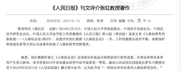 张红《人格权总论》一书于2014年1月获中国人民大学常务副校长王利明教授刊于《人民日报》第七版(理论版)的高度评价。
