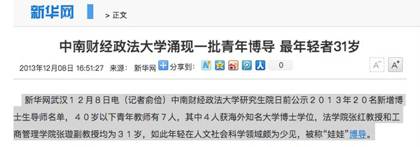 新华网2013年12月也曾报道中南财经政法大学研究生院公示了2013年20名新增博士生导师名单,其中特别提及法学院张红教授为31岁,“如此年轻在人文社会科学领域颇为少见,被称‘娃娃’博导。”