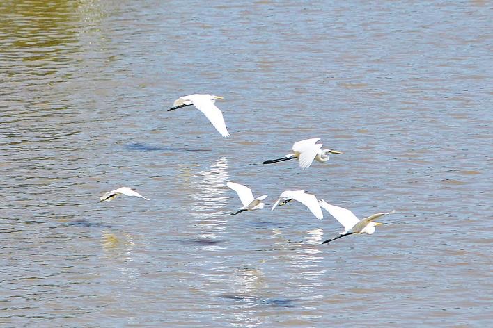 9月24日,十堰市郧阳湖国家湿地公园,鹭鸟在湖面觅食。连日来,受强降雨影响,郧阳湖国家湿地公园水位回升,吸引大批鹭鸟来此觅食。