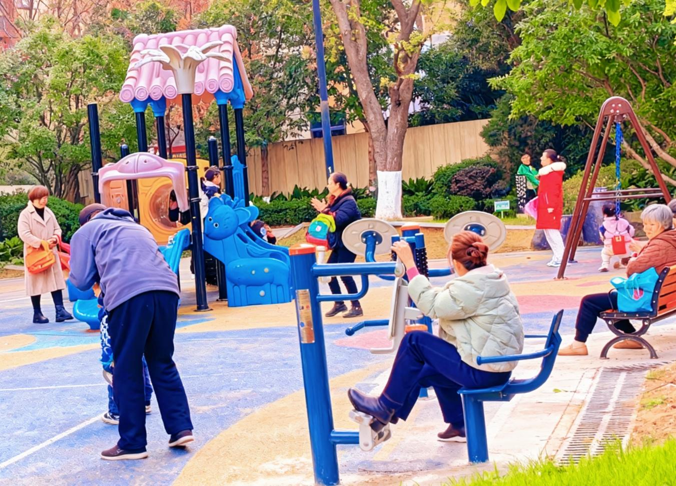 万岭社区海伦国际小区住户逾四千,老年人与学龄前儿童占比近三成,但此前公共活动设施不足。改造从精准问需开始,社区通过召开露天议事会、网格员入户走访等方式,广泛收集居民意见。“健身器材要安全稳固”“选址需考虑噪声影响”“希望能有休息座椅便于照看孩子”……一条条具体诉求被认真记录、梳理,最终凝聚成一份以服务老年人与儿童为核心的“民生痛点清单”与焕新方案。