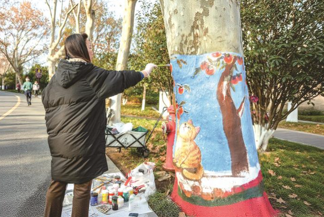 12月27日,极目新闻记者在武汉东湖绿道看到,湖中道沿线许多大树的树干披上了“彩衣”:有的裹着五彩毛衣,有的绘着小猫、恐龙等动物图案。画师们正使用环保丙烯颜料,结合树的形态与纹理进行创作,各种动物形象栩栩如生,与周围环境浑然一体,既充满童趣,又巧妙修饰了树干的自然破损,让游客们纷纷驻足拍照打卡。(楚天都市报极目新闻记者李辉 丁晨 通讯员高梦雅摄影报道)