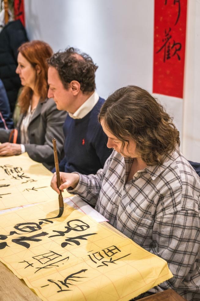 在书法体验环节,来自巴西的湖北大学教师米格尔格外引人注目。在武汉生活六年的他,早已习惯春节写春联、贴福字。活动中,他不仅流畅书写福字,更创意融入小马图案,用中文写下新春祝愿,成为全场“氛围担当”。米格尔说:“在中国过年是一种温暖的仪式,我很享受这种参与感。”