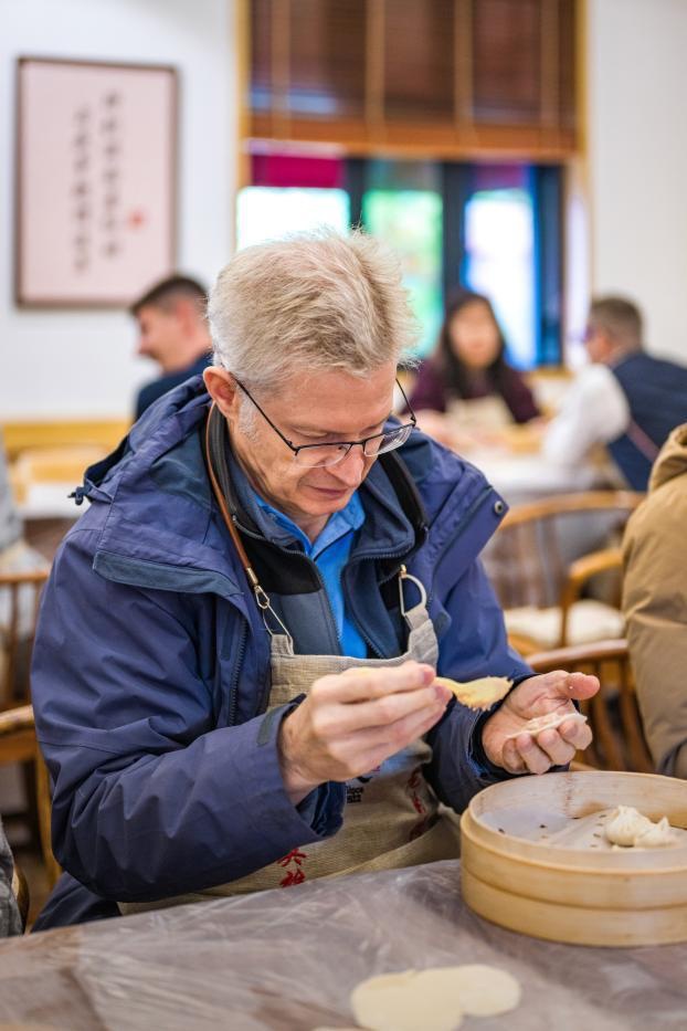 活动首站来到拥有104年历史的武汉老字号“四季美”。四季美汤包技艺的第四代传承人肖喻康现场教学,外国专家们仔细观摩如何擀皮、包馅、捏出十八道褶。外国专家代表在尝试后笑称:“It's not easy!”也有人发挥创意,将汤包包成饺子形状,现场笑声不断。当热腾腾的汤包上桌,一口咬下汤汁四溢,大家纷纷感叹武汉小吃的匠心与智慧。