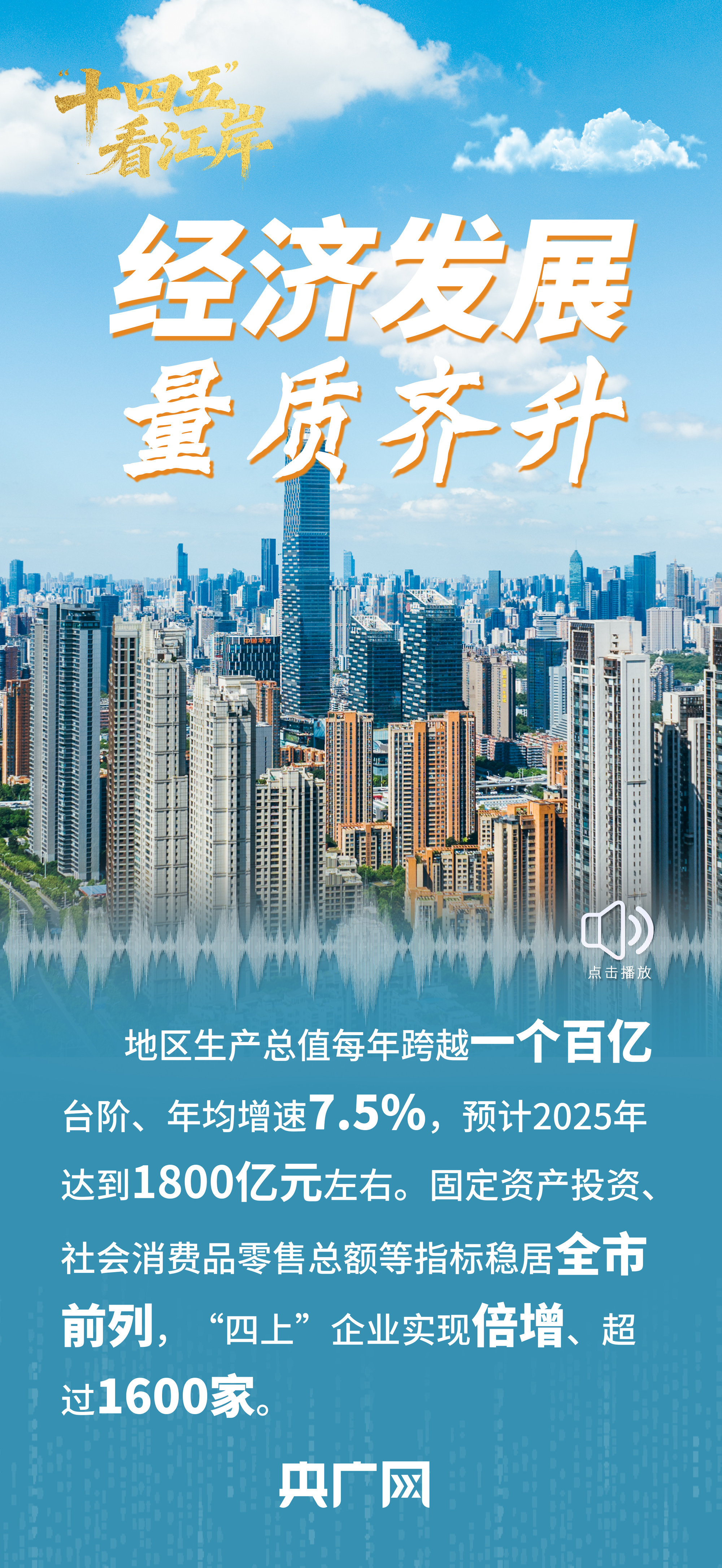 12月11日,中共江岸区委十三届十九次全会举行。“十四五”以来,江岸区加快推进经济发展转型、城市建设转型、城区治理转型,高质量发展迈出坚实步伐。央广网联合中共江岸区委宣传部发布有声海报,共同回顾江岸“十四五”经济社会发展精彩答卷。