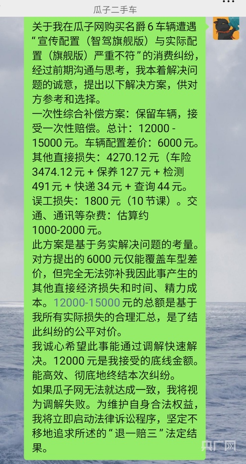 10月17日,李先生对瓜子二手车平台提出一次性综合补偿方案(央广网发 受访者供图)