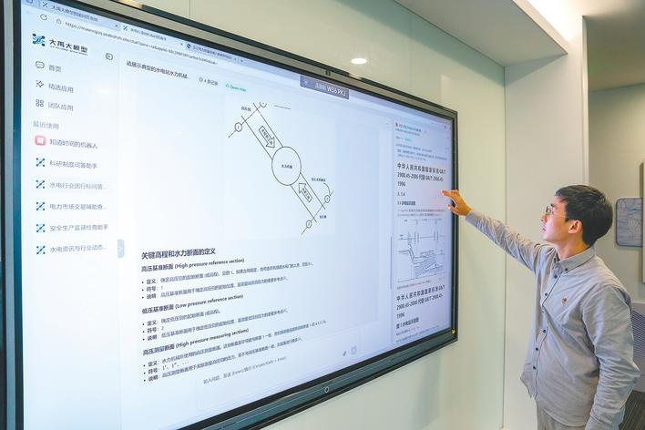 10月13日,三峡科创园牵头研发的大禹大模型正与技术人员进行人机交互对话。“大禹”的突破,在于实现了水电专业知识与AI技术的深度融合。(湖北日报全媒记者 魏铼 摄)