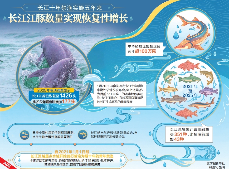 1月30日上午,国务院新闻办举行新闻发布会,介绍长江十年禁渔中期评估情况。记者从会上获悉,2025年,长江江豚种群数量已恢复到1426头。