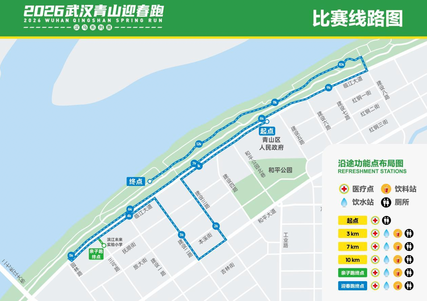 本次赛事选址武汉市青山区,设置两大参赛项目满足不同群体需求。其中,迎春跑项目全程约13公里,设有参赛名额6000人;亲子跑项目全程约5公里,共设2000个参赛名额,特别适合家庭携手参与,共享运动乐趣。赛事起点统一设置在武汉市青山区人民政府,迎春跑终点为青山江滩建二都市广场,亲子跑终点则位于三弓路的青山区滨江未来实验小学。