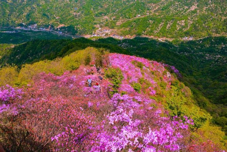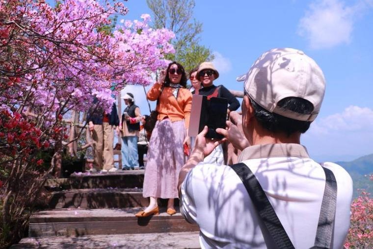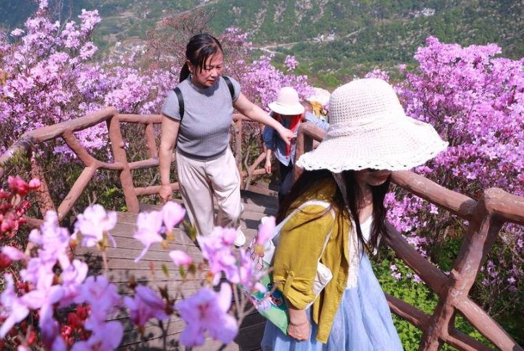 笔者看到,景区停车场停满旅游大巴和私家车,游客络绎不绝、接踵而至。从山脚仰望,山脊线被五彩杜鹃泼染成流动的“彩虹”,漫山花色如巨幅绸缎在风中起伏摇曳。登上山顶,海拔近千米的山脊上,五彩古杜鹃群沿着山脉竞相盛开,形成绵延十里的“五彩丝带”。这里的杜鹃花以红色为主打,深红、粉红、深紫、灰紫、鹅黄、淡白等色彩交织,宛若仙境,其中稀有的野生紫色杜鹃绽放更具特色。山上十里“画廊”五彩杜鹃肆意绽放,引得沿途游客纷纷叫好,仿佛忘了疲惫,时而逗留拍照打卡,时而翩翩起舞,好不惬意。