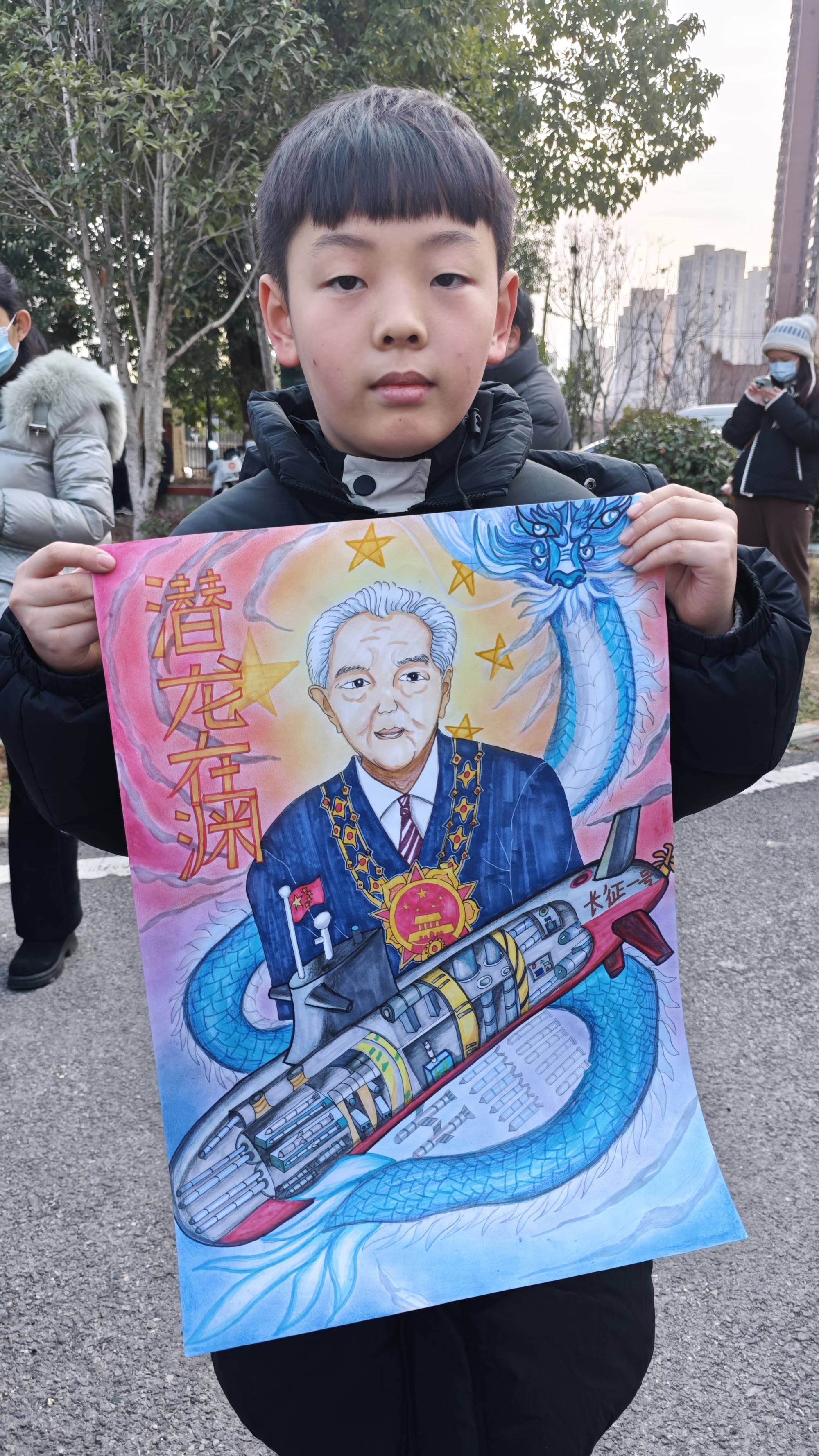 武汉市洪山实验外国语小学四年级学生吕昀骁带着自己绘制的《潜龙在渊》送别黄院士(央广网记者邓子依 摄)