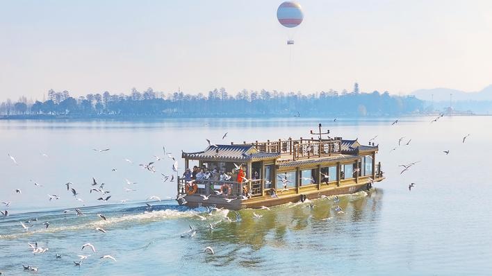 西伯利亚红嘴鸥即将北归,新春假期,游客乘东湖游船感受红嘴鸥伴飞。(湖北日报通讯员 钟珊 摄)