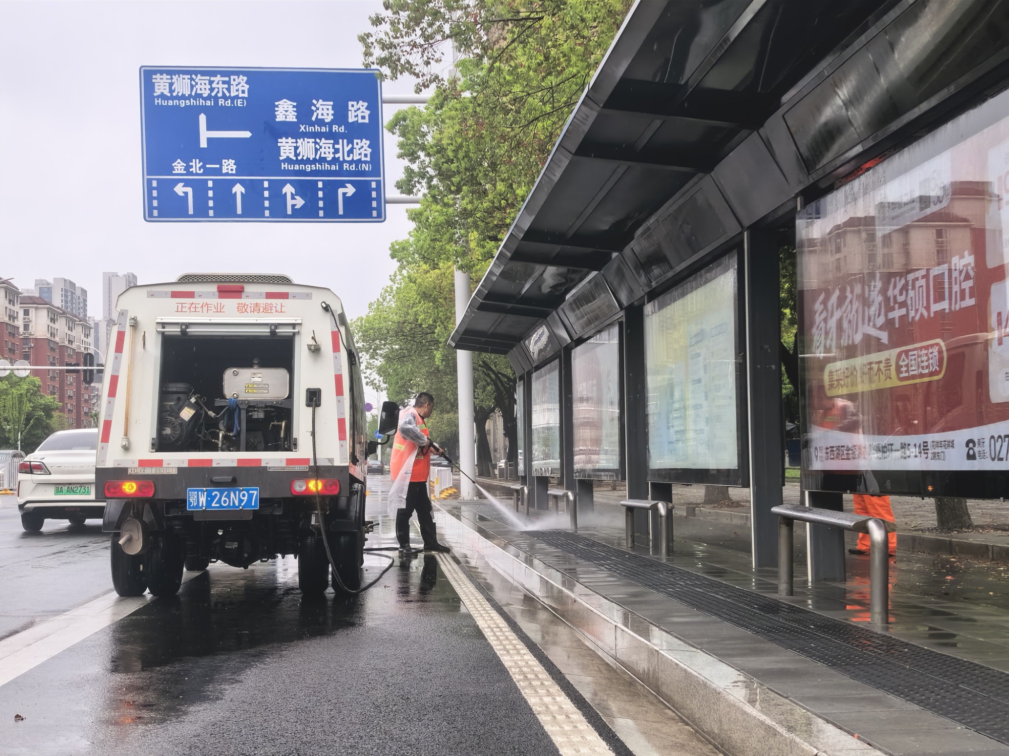 9日下午,东西湖区环卫工人冲洗金北一路公交站台。通讯员黄彬 摄