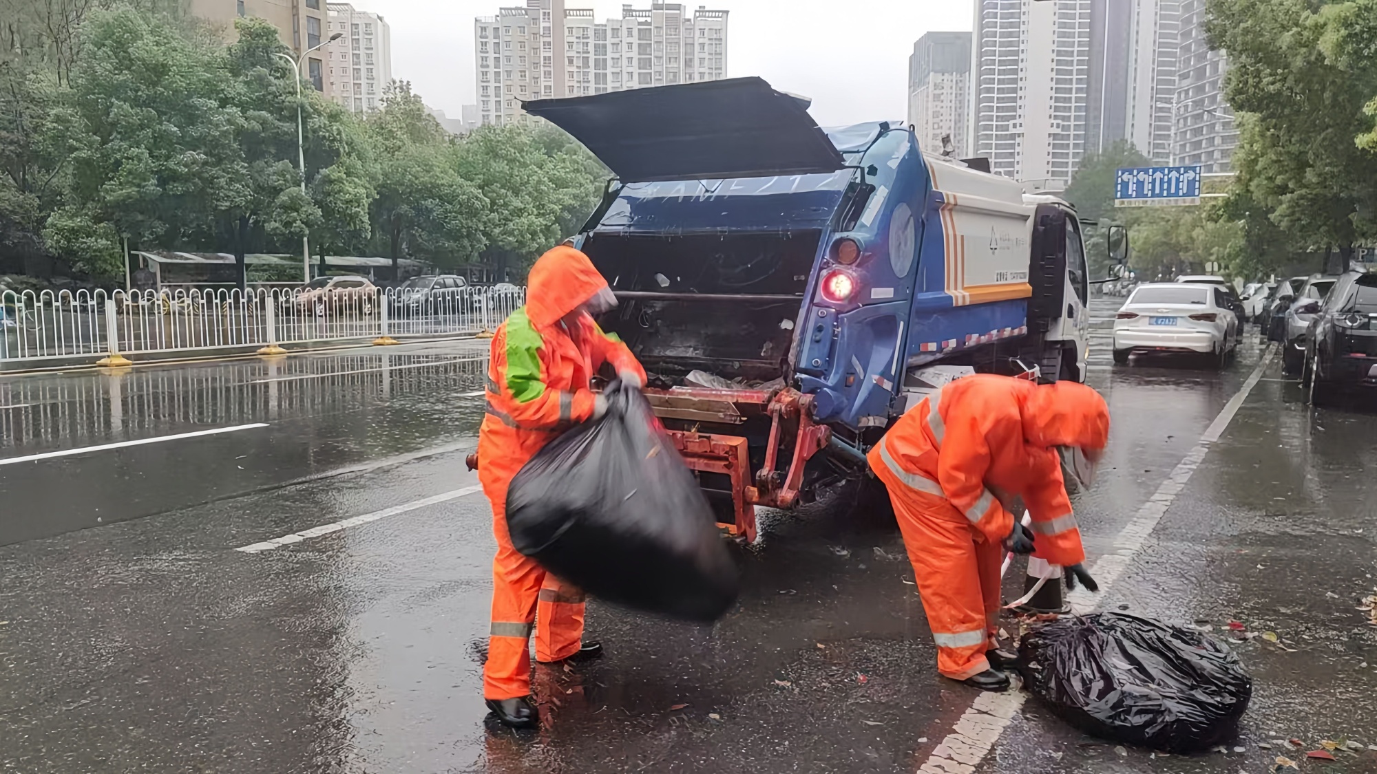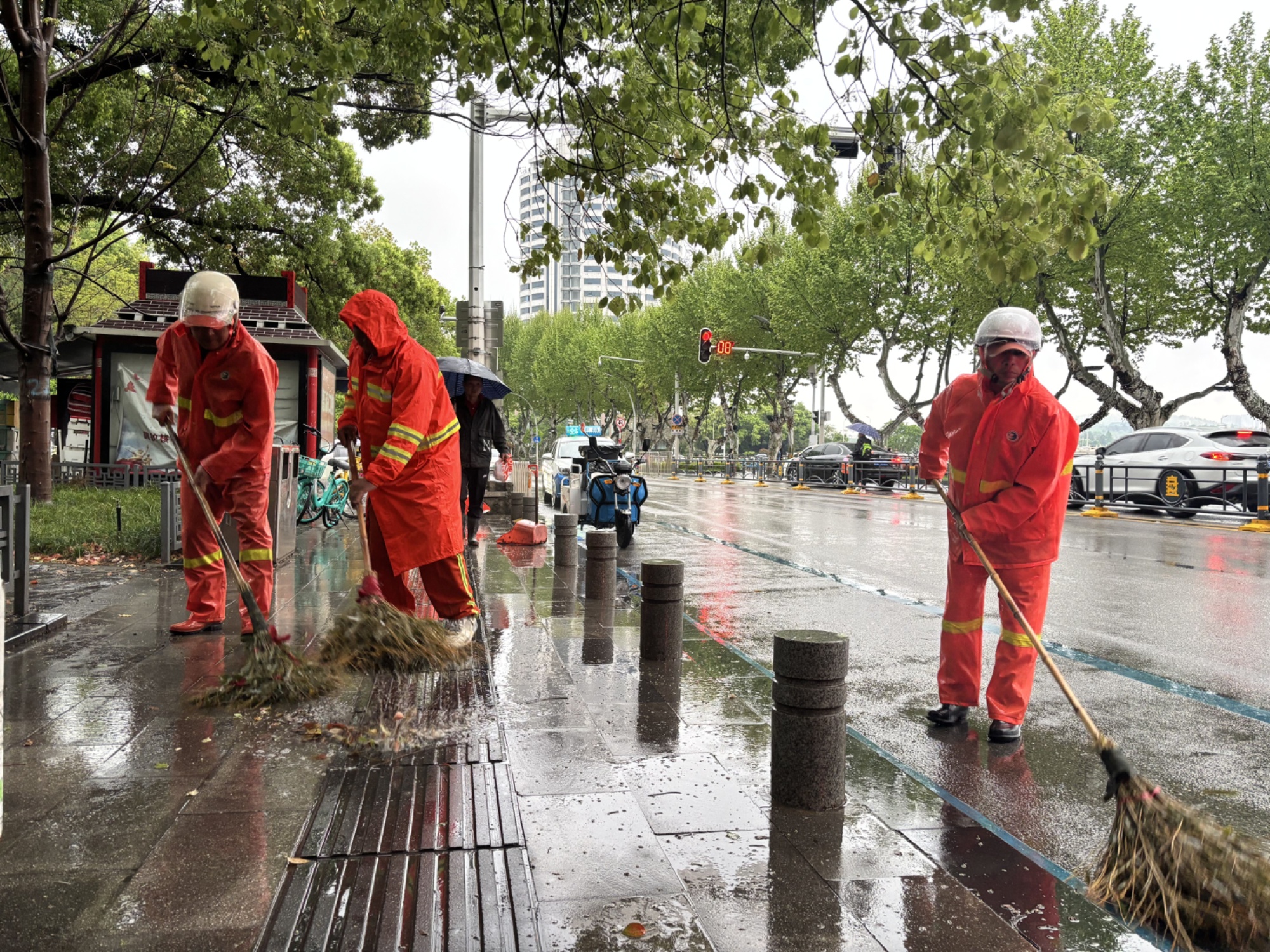 在塔子湖东路体育馆周边,江岸区环卫工人正对后湖大道、金桥大道沿线进行细致巡查。下午3时,仍有零星降雨,环卫工人加大了巡查频次,及时清理被风雨吹落的树叶、断枝,确保道路畅通无阻。