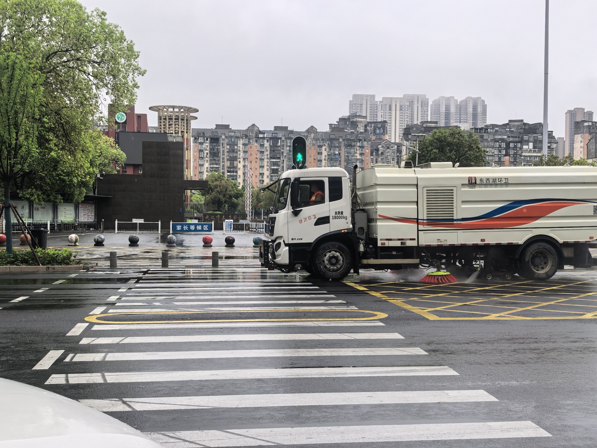 在东湖路,武昌区城管执法局中南路清洁队的环卫工人正在紧张忙碌着:高压冲洗车缓缓行驶,高压水枪喷出强劲水流,将人行道、非机动车道上积存的淤泥、污垢逐一冲净;洗扫车紧随其后对路面进行“地毯式清扫”,不留死角。“我们在雨停以后,通过‘人工+机械’协同优势,以最快速度还市民一条干净整洁的出行路。”中南路清洁队负责人范帆介绍。