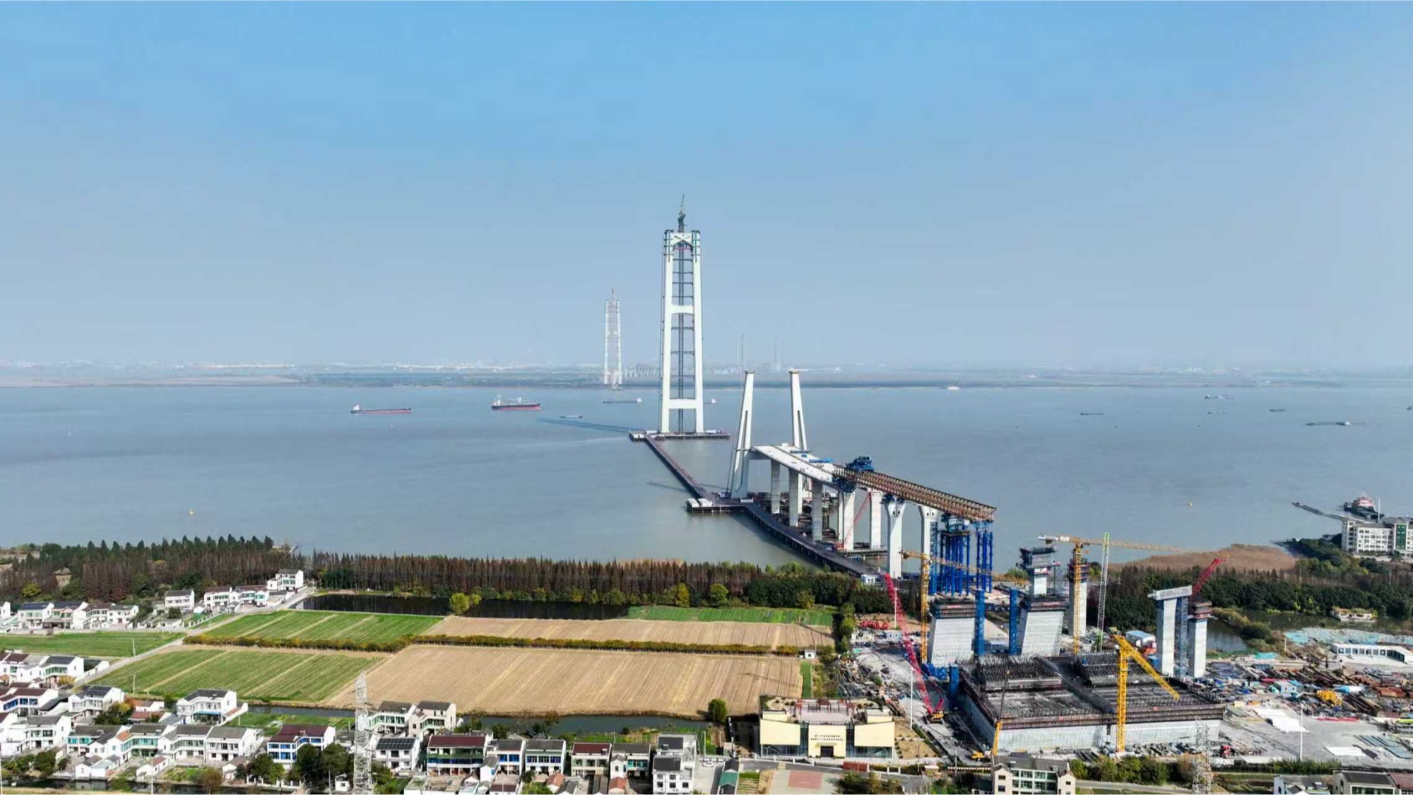 目前,全桥关键工点正齐头并进,南、北航道桥的主塔与锚碇施工协同展开,为后续缆索系统安装奠定了坚实基础。
