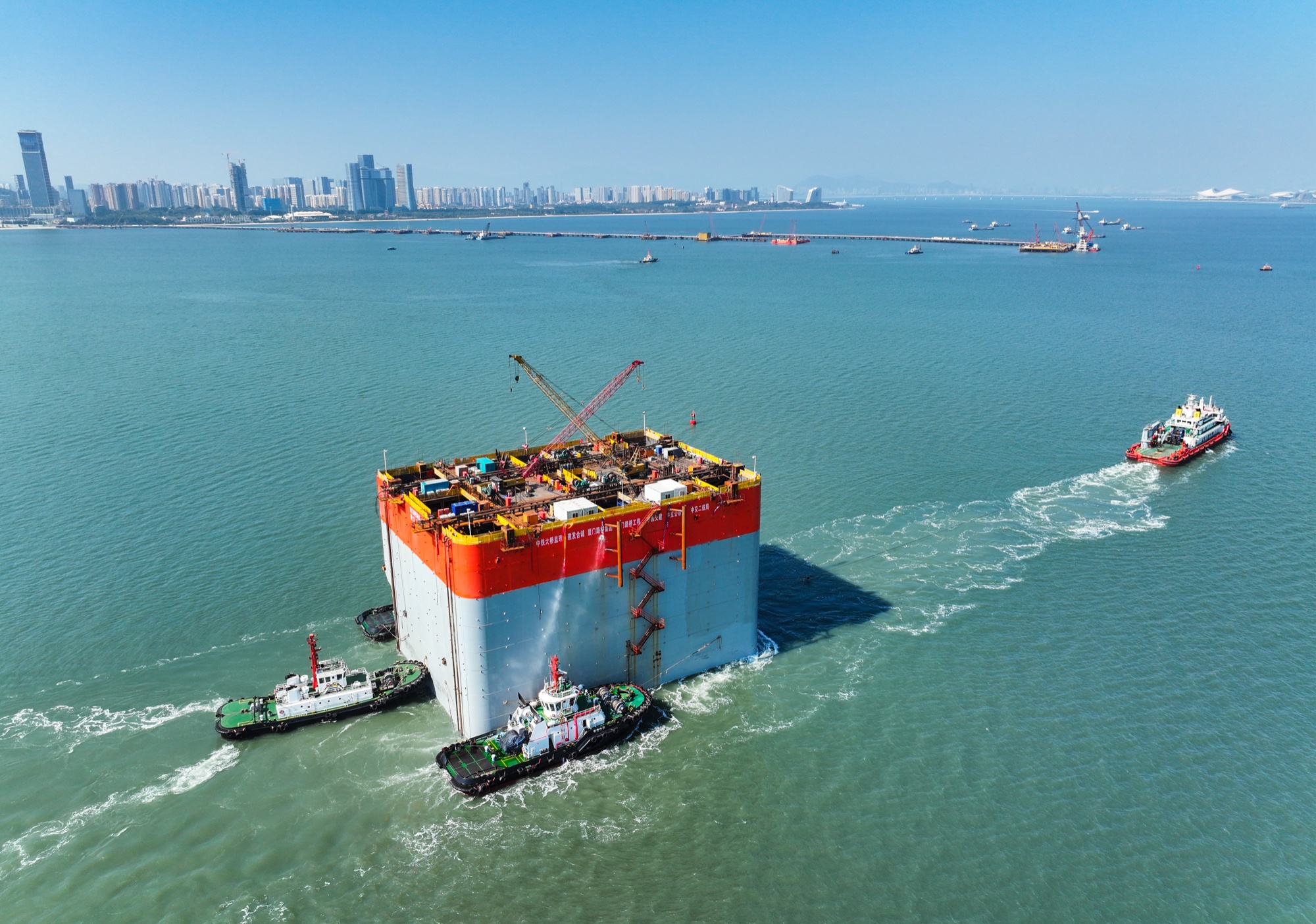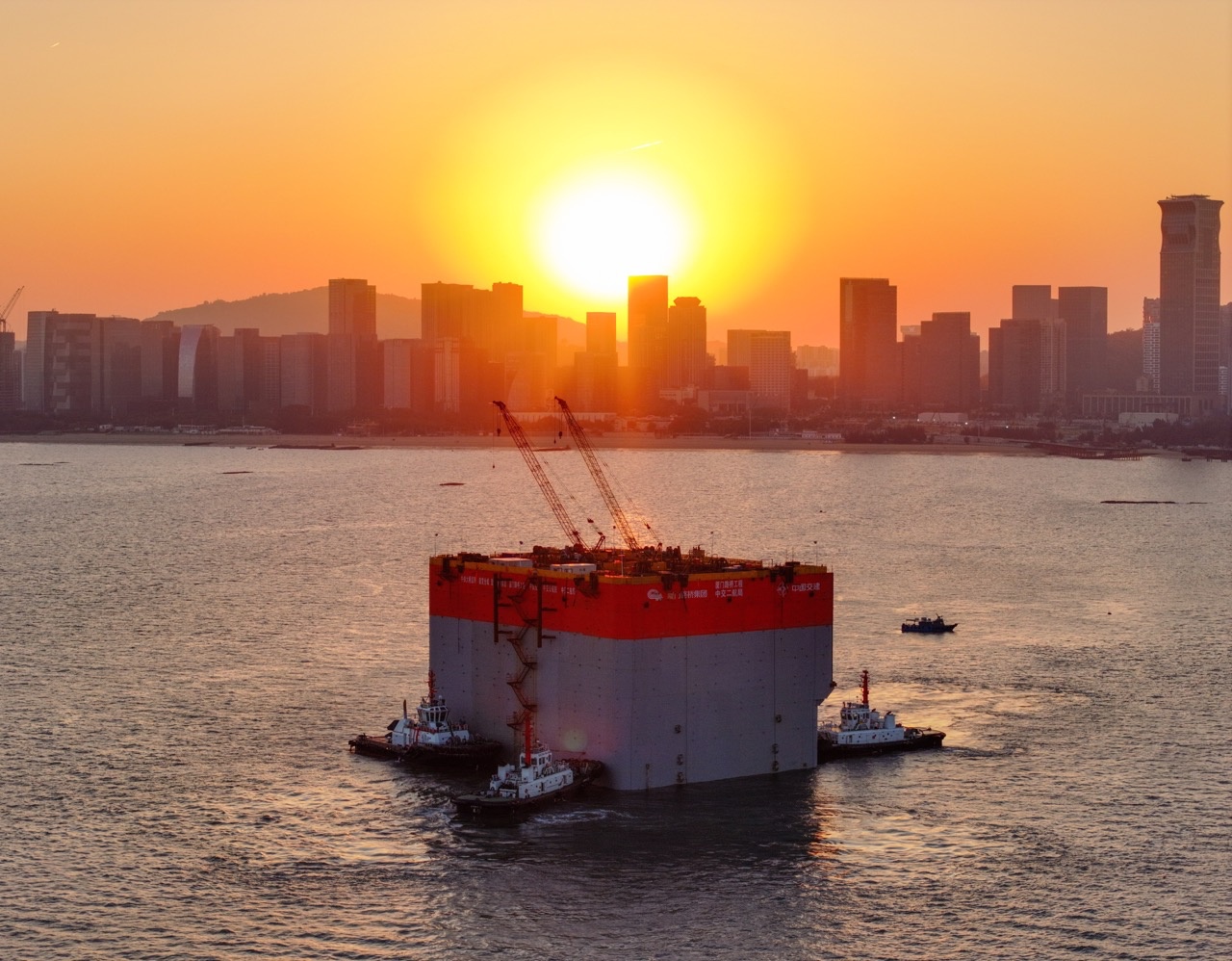 2024年12月25日,厦金大桥(厦门段)项目刘五店航道桥西锚碇首个钢沉井从泉州船厂出坞,跨海穿越159公里,历经27小时抵达厦金大桥(厦门段)施工现场。