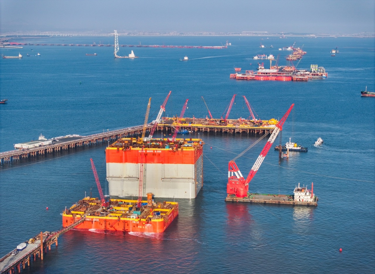 经过72小时连续奋战,首个沉井下沉至设计标高。经多点测量,各脚点误差控制在2厘米以内,沉井稳稳落入预设基坑,整个过程堪称“深海穿针”。(来源:中交二航局)