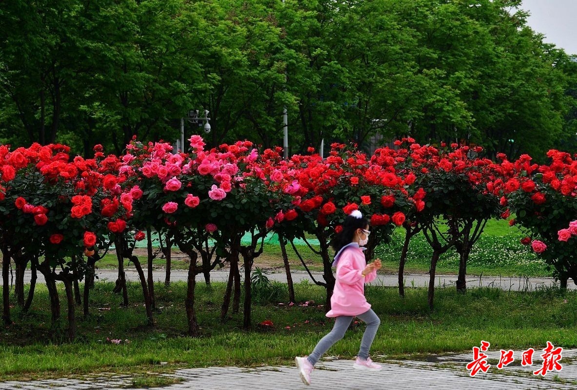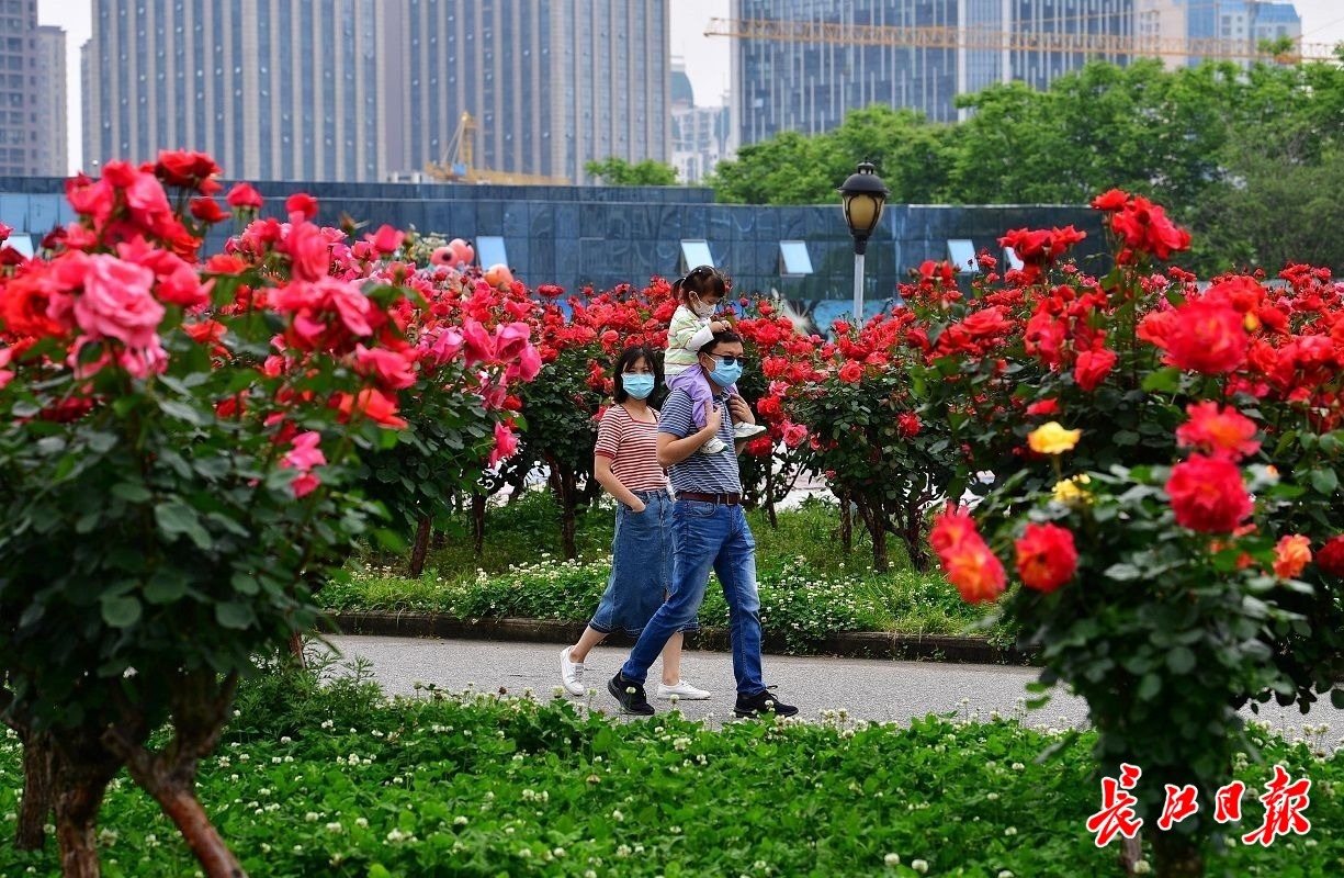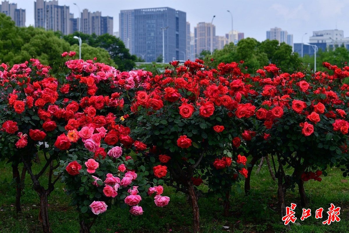 长江日报大武汉客户端4月23日讯 4月23日,记者看到,武汉市江汉区泛海广场旁,数百株2米多高的“大树”月季进入了盛花期,碗口大的花朵开满枝头,花色红艳,花香浮动,吸引不少市民流连花间,驻足观赏。大片的月季花林,与周围的草地、绿树和鳞次栉比的摩天大楼相映成景,美不胜收。据了解,树状月季大多是将花量大、花色美的月季嫁接在蔷薇树干上培育而来,让原本爬藤或者低矮的月季变成高大的月季树,营造出高贵典雅、形状独特的观赏效果。(长江日报记者李永刚 摄影报道)