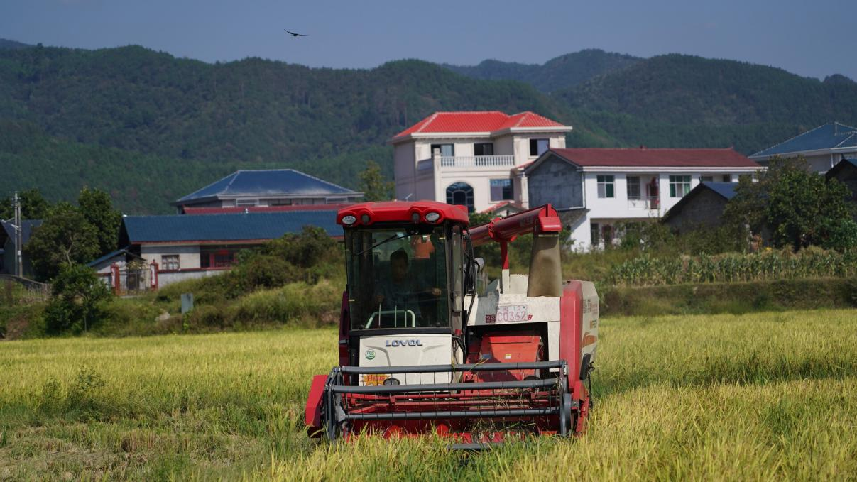 基地内收割稻谷的农机(中方县融媒体中心 供图)