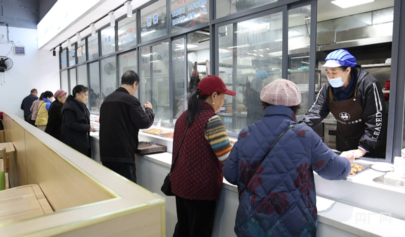 在冷水滩区长者食堂清桥社区店,厨房内一派繁忙景象,顾客们正井然有序地排队打菜,荤素搭配既营养又美味,60岁以上的老年人可享受与年龄对应的就餐折扣。