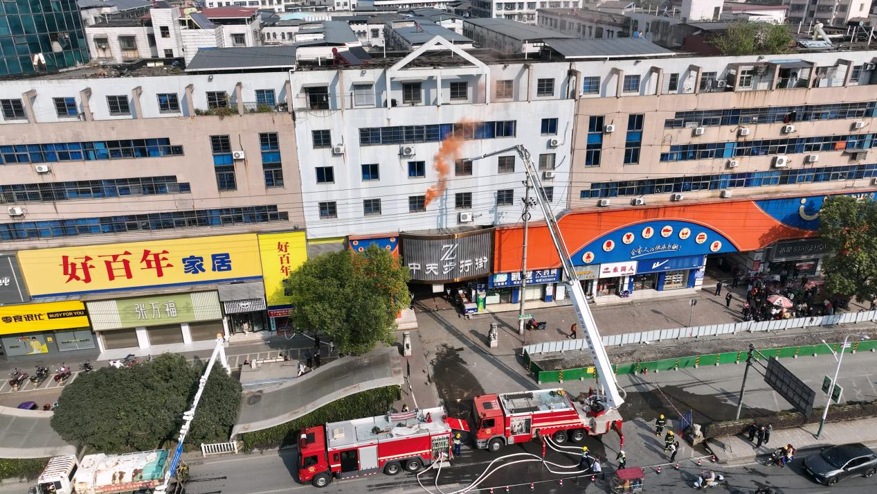 演练模拟鲤鱼江市场二楼一家居店因电器线路故障引发火灾。火势迅速蔓延,浓烟扩散至上层居民楼,市场二楼网吧、起火店铺及居民楼楼顶均有人员被困。资兴市应急救援指挥部接报后立即启动应急响应,成立现场总指挥部,统筹指挥综合协调、灭火救援、现场管控、初期处置、信息核查、新闻发布、舆情处置等7个工作组展开行动。