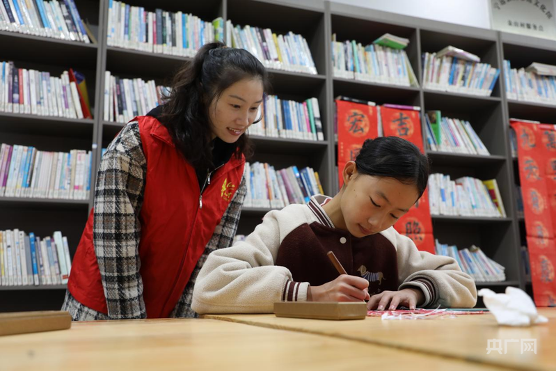 在朵山村书画馆内,青年人才老师正手把手指导孩子们握刻刀、雕纹样,隔壁教室里的书法老师则握着孩子们的小手练习毛笔字。这些全程免费的公益课程,让村里的孩子们在家门口就享受到了优质的文化教育资源。“我在这里学习两年了,学会了画画、剪纸和写毛笔字,还会分享给爷爷奶奶。周末在这里和小伙伴一起学习成长,特别开心。”朵山村孩子吉慧玲笑着说。