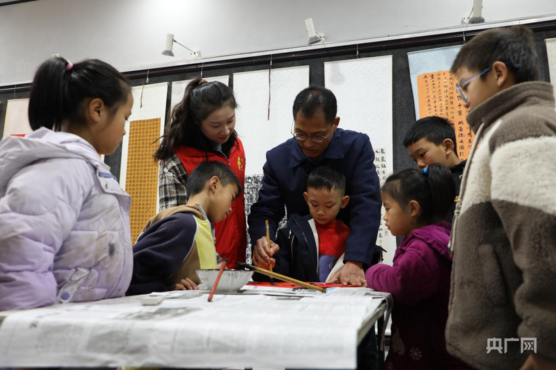 书法老师指导孩子写毛笔字(央广网发 万柏慧 摄)