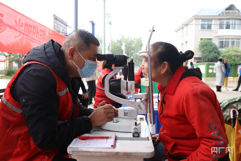 “健康角”前,志愿者为村民进行眼睛检查(央广网发 宾奕 摄)