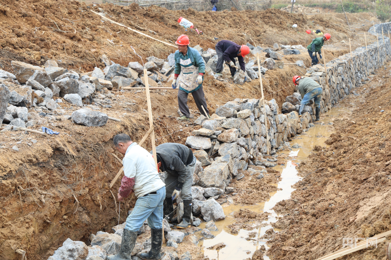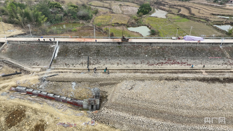 仁湾街道罗建村的战备水库现场,施工人员正加紧砌筑干砌石挡墙(央广网发 陈彦希 摄)