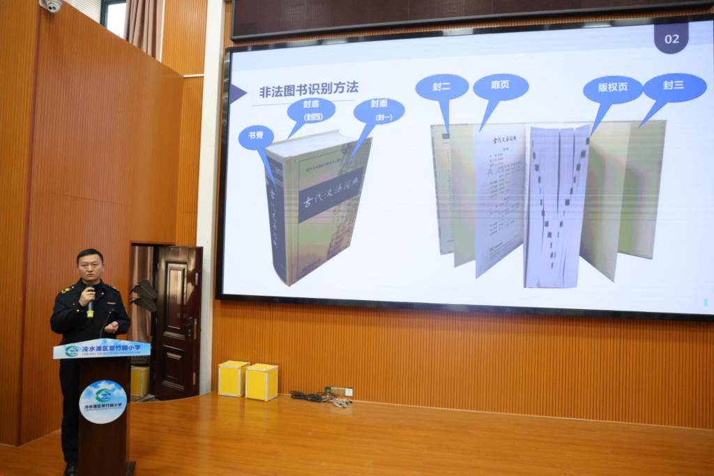 紧接着,活动进入知识宣讲环节,永州市文化市场综合行政执法支队的工作人员通过生动有趣的案例、通俗易懂的语言,向同学们详细讲解了非法出版物的危害以及如何辨别有害信息等知识,详细讲解了非法出版物纸张粗糙、错别字多、版权信息缺失等典型特征,并结合贴近校园生活的案例,让同学们掌握了实用的辨别技巧。随后,法院工作人员开展了未成年人保护法律专题讲座。他们结合真实案例,以通俗易懂的语言解读了未成年人保护相关法律法规,深入剖析了网络不良信息、校园欺凌等常见风险隐患,并指导同学们如何运用法律武器维护自身合法权益,提醒大家时刻提高警惕,远离不良诱惑。