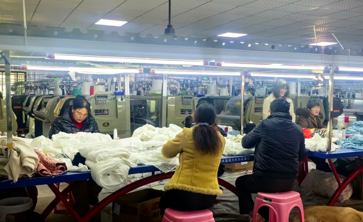 1月4日,湖南省嘉禾县珠泉镇横垌村鹰鹏针织服装厂生产车间内,51岁的村民曾满英熟练操作着机器,赶制发往广东的订单。